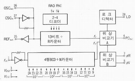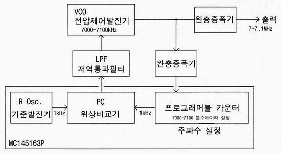 <±×¸² 2> PLLÁ֯ļö ½Åµð»çÀÌÀúÀÇ ±âº» ºí·°µµ ¿¹¸¦µé¾î ±âÁØ Á֯ļö(fr)°¡ 10kHzÀ̰í ÇÁ·Î±×·¡¸ÓºíÄ«¿îÅÍÀÇ °ª(N)ÀÌ 14450ÀÌ ¶ó¸é 10,000×14450=144,500,000 ·Î Ãâ·ÂÁ֯ļö´Â 144.500MHz °¡ µÈ´Ù. ¹°·Ð À̶§ VCO´Â 144MHz´ëÀÇ ¹ßÁø ¹üÀ§¸¦ °¡Á®¾ß ÇÒ °ÍÀ̰í ÇÁ·Î±×·¡¸ÓºíÄ«¿îÅ͵µ 144MHz´ë¸¦ 14450·Î ºÐÁÖÇÒ ¼ö ÀÖ´Â °ÍÀ̶ó¾ß ÇÒ °ÍÀÌ´Ù. ÀÌ·¸°Ô VCOÀÇ ¹ßÁø Á֯ļö¸¦ ¹Ù·Î ÇÁ·Î±×·¡¸ÓºíÄ«¿îÅÍ·Î ºÐÁÖÇÏ¿© À§»óºñ±³±â(PC)·Î ºñ±³ÇÏ´Â ¹æ½ÄÀ» Á÷Á¢ ¹æ½Ä PLLÁ֯ļö ½Åµð»çÀÌÀú¶ó°í ÇÑ´Ù. À§ ¿¹ÀÇ ÇÁ·Î±×·¡¸ÓºíÄ«¿îÅÍ´Â 144MHz´ë¸¦ 14450·Î Á÷Á¢ ºÐÁÖÇÏ¿´´Âµ¥ ÀÌ·¸°Ô ³ôÀº Á֯ļö¸¦ Á÷Á¢ ºÐÁÖÇÒ ¼ö ÀÖ´Â ÇÁ·Î±×·¡¸ÓºíÄ«¿îÅÍ´Â ÈçÄ¡ ¾ÊÀ¸¸ç ÁÖ·Î VCO¹ßÁø Á֯ļö¸¦ ±¹ºÎ ¹ßÁø±â¸¦ ¸¸µé¾î È¥ÇÕÇÏ¿© ³·Àº Á֯ļö·Î ¹Ù²Ù¾î ÇÁ·Î±×·¡¸ÓºíÄ«¿îÅÍ·Î ºÐÁÖÇÏ¿© »ç¿ëÇÏ´Â °æ¿ì°¡ ¸¹ÀÌ ÀÖ´Ù. ÀÌ ¹æ½ÄÀ» Á֯ļö ¹Í½Ì¹æ½Ä PLLÁ֯ļö ½Åµð»çÀÌÀú¶ó°í Çϸç ÁÖ·Î UVÆ®·£½Ã¹ö¿¡¼ ¸¹ÀÌ º¼ ¼ö ÀÖ¾úÀ¸³ª ÃÖ±Ù ¸¸µé¾îÁö´Â UVÆ®·£½Ã¹ö¿¡¼´Â ¿øÄ¨È µÇ¾îÀÖ°í ´ÙÀ½¿¡ ¼³¸íÇϰíÀÖ´Â ÇÁ¸®½ºÄÉÀÏ·¯¹æ½Ä PLLÁ֯ļö ½Åµð»çÀÌÀú°¡ ¸¹ÀÌ ÀÌ¿ëµÇ°í ÀÖ´Ù. ÀÌ ÇÁ¸®½ºÄÉÀÏ·¯¹æ½Ä PLLÁ֯ļö ½Åµð»çÀÌÀú´Â ¼ö½ÊMHzÁ¤µµ±îÁö¸¸ ºÐÁÖÇÒ ¼ö ¾ø´Â ÇÁ·Î±×·¡¸ÓºíÄ«¿îÅ;տ¡ ÇÁ¸®½ºÄÉÀÏ·¯¸¦ µÎ¾î Çѹø ºÐÁÖÇÑ ÈÄ ÇÁ·Î±×·¡¸ÓºíÄ«¿îÅ͸¦ »ç¿ëÇÏ´Â ¹æ½ÄÀ» ¸»ÇÑ´Ù. ¿©±â¼ Á÷Á¢ »ç¿ëÇÒ ¹æ½ÄÀº Á÷Á¢ ¹æ½Ä PLLÁ֯ļö ½Åµð»çÀÌÀú¸¦ »ç¿ëÇϸç À§»óºñ±³±â, ±âÁØ ¹ßÁøÈ¸·Î¿Í ÇÁ·Î±×·¡¸ÓºíÄ«¿îÅͰ¡ ÇϳªÀÇ IC¾È¿¡ µé¾îÀÖ´Â MC145163P¸¦ »ç¿ëÇÏ¿´À¸¸ç ¿©±â¿¡ ³»ÀåµÈ ÇÁ·Î±×·¡¸ÓºíÄ«¿îÅÍ´Â Àü¿øÀü¾Ð 5V¿¡¼ 30MHzÁ¤µµ±îÁö »ç¿ëÀÌ °¡´ÉÇϸç Àü¿øÀü¾ÐÀ» 8VÁ¤µµ ¿Ã¸®¸é 80MHzÁ¤µµ±îÁöµµ Á÷Á¢ »ç¿ëÀÌ °¡´ÉÇÑ PLL ICÀÌ´Ù. ÀÌ IC¸¦ ÀÌ¿ëÇÏ¿© 144¡146MHz´ë PLL VFO¸¦ ±¸¼ºÇØ º»´Ù¸é 140MHz(46.666MHz×3)¸¦ ¹ßÁøÇÏ´Â ¹ßÁø±â¿Í VCOÀÇ Ãâ·ÂÁ֯ļö¸¦ È¥ÇÕÇÒ ¼ö Àִ ȸ·Î°¡ ÇÊ¿äÇϸç, ±âÁØÁ֯ļö¸¦ 10kHz·Î Çϰí ÇÁ·Î±×·¡¸ÓºíÄ«¿îÅ͸¦ 400¡599»çÀ̸¦ »ç¿ëÇϰԵǸé 10kHz ½ºÅÜÀÇ 144.00¡144.59MHz°¡ ¾ò¾îÁö°Ô µÈ´Ù. ¾Æ·¡ ºí·Ï´ÙÀ̾î±×·¥À» Âü°íÇϽñ⠹ٶõ´Ù.